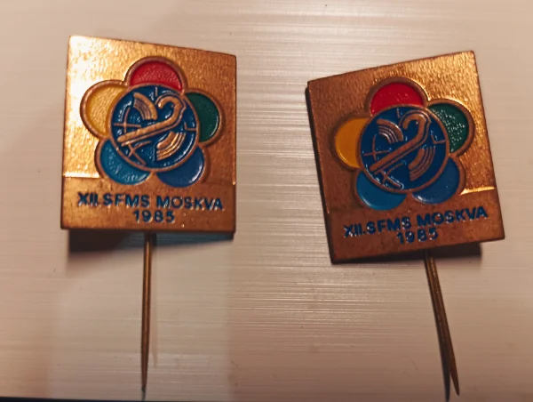 Pins oficiales del XII Festival Mundial de la Juventud y los Estudiantes, celebrado en Moscú en 1985. Fabricados en la Unión Soviética, estos pins conmemoran uno de los eventos internacionales más importantes de la juventud comunista y progresista. Cada pin muestra el emblema oficial del festival, con una representación estilizada de una paloma de la paz sobre un fondo de cinco pétalos en colores amarillo, rojo, verde, azul y blanco, simbolizando la diversidad y unidad de los pueblos. Debajo del emblema se lee la inscripción «XII SFMS MOSKVA 1985» en letras azules. Estos pins están en buen estado de conservación y representan una pieza de coleccionista ideal para aquellos interesados en la historia de los movimientos juveniles y la simbologÃa de la paz y la solidaridad entre naciones.